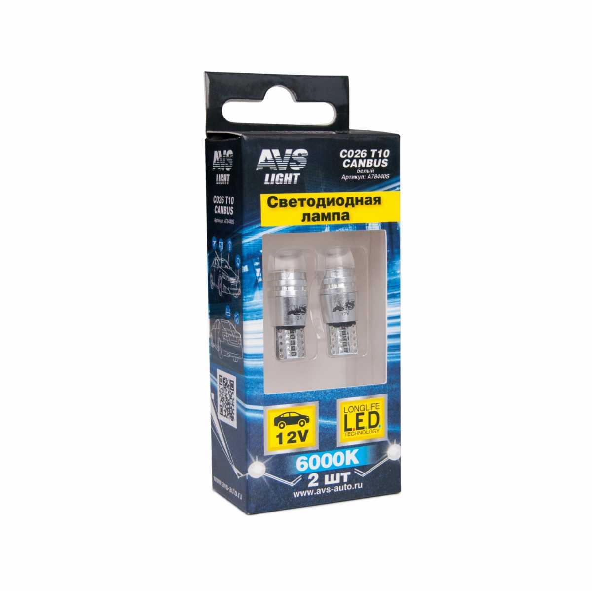 Светодиод Т10 12V С026 (W2.1х9,5D) 3W PSB блистер 2шт (белый) AVS A78440S